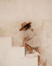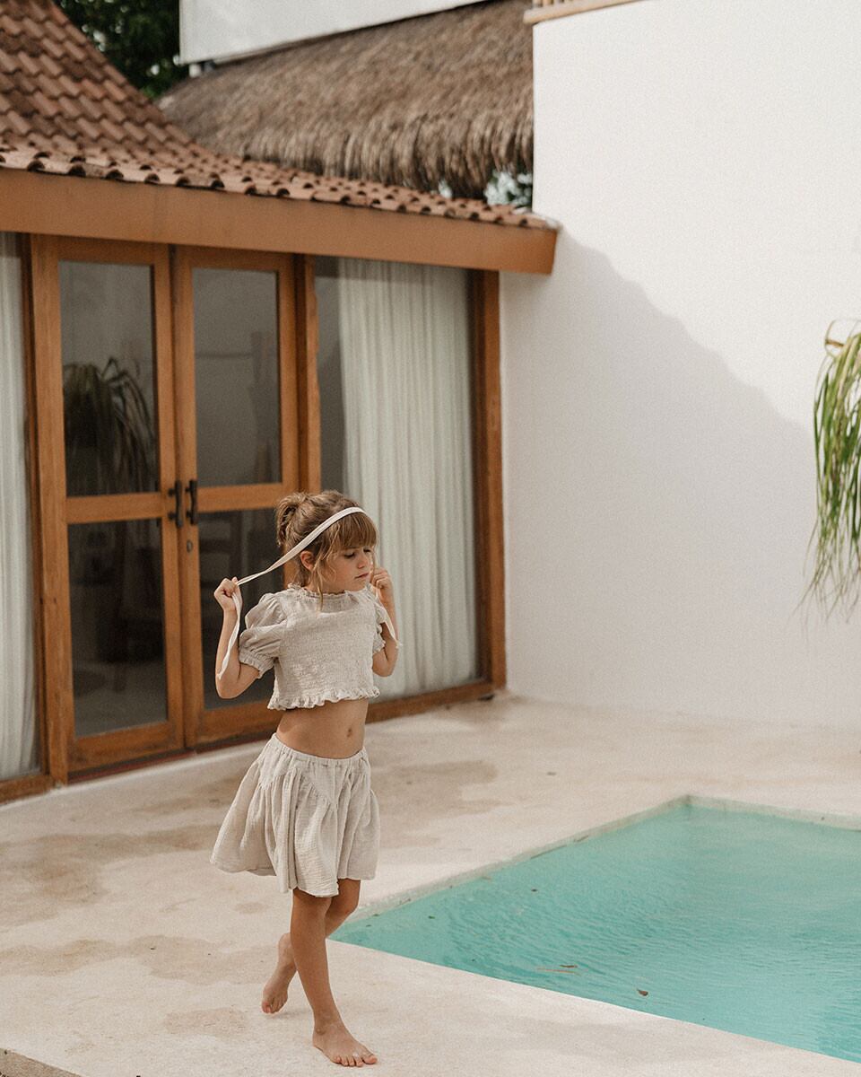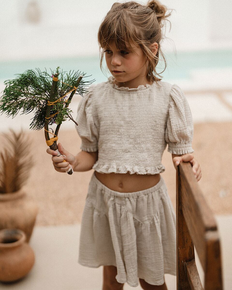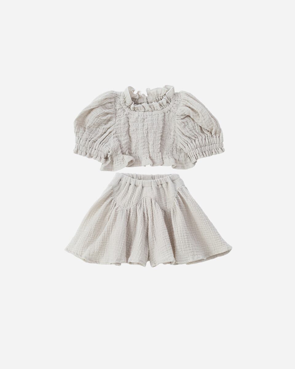柔らかく伸縮性があり、とても甘いこのセットは、ハンドスモッキングのボディスとパフスリーブのトップスに、ミニスカートのように見える流れるようなショートパンツを組み合わせています。