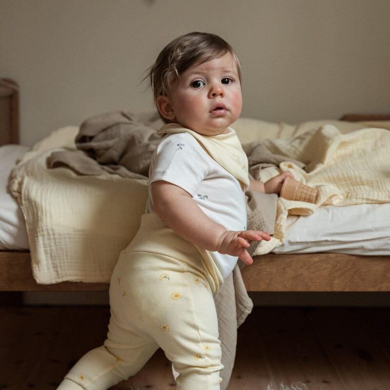 シルクのように柔らかいベビー パンツは、伸縮性に優れた幅広の折り畳み式の袖口で構成されており、最適な快適さで、ずれません。