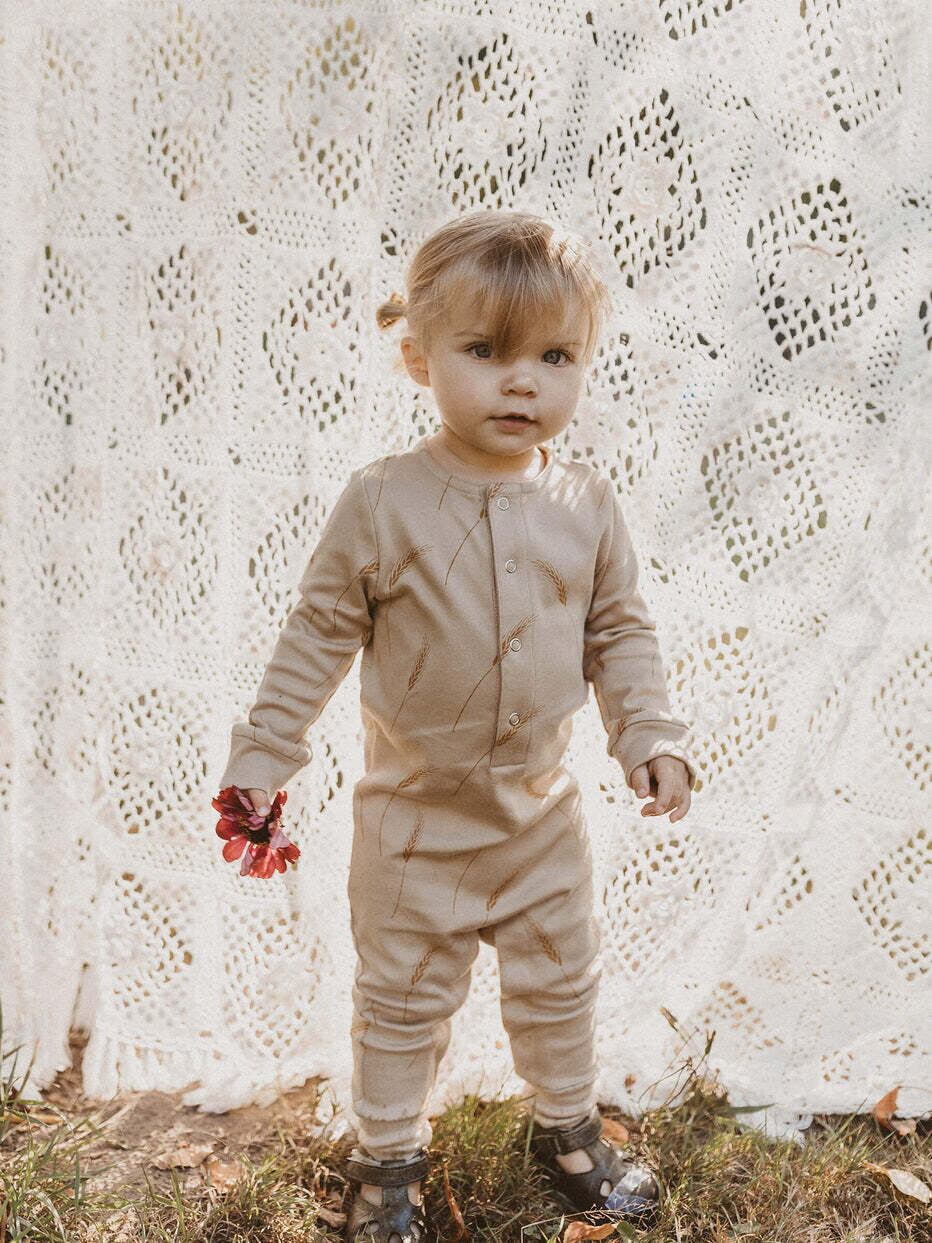 ヘンリープラケットと脚のスナップボタンが特徴で、簡単に着替えたり着替えたり出来ます。