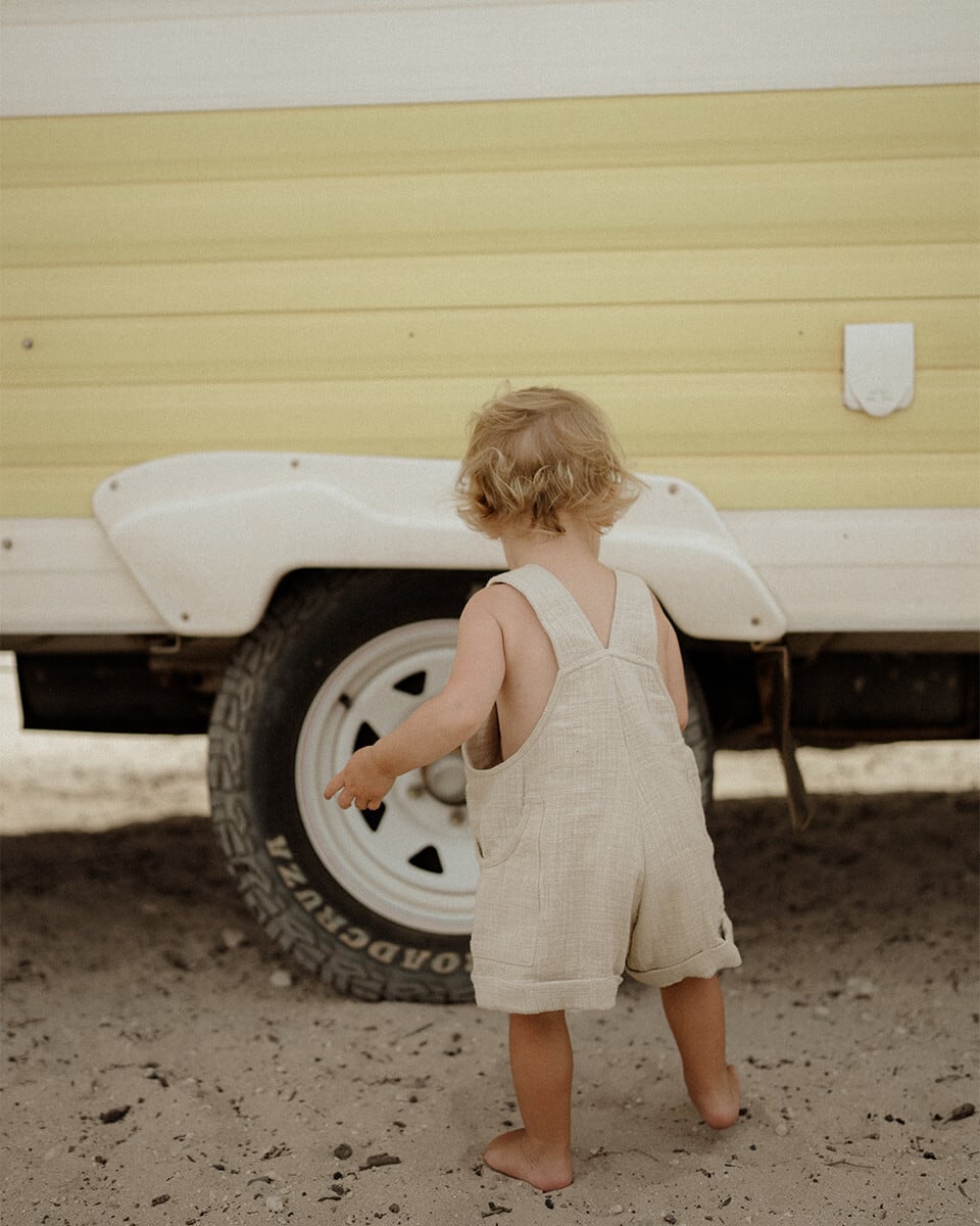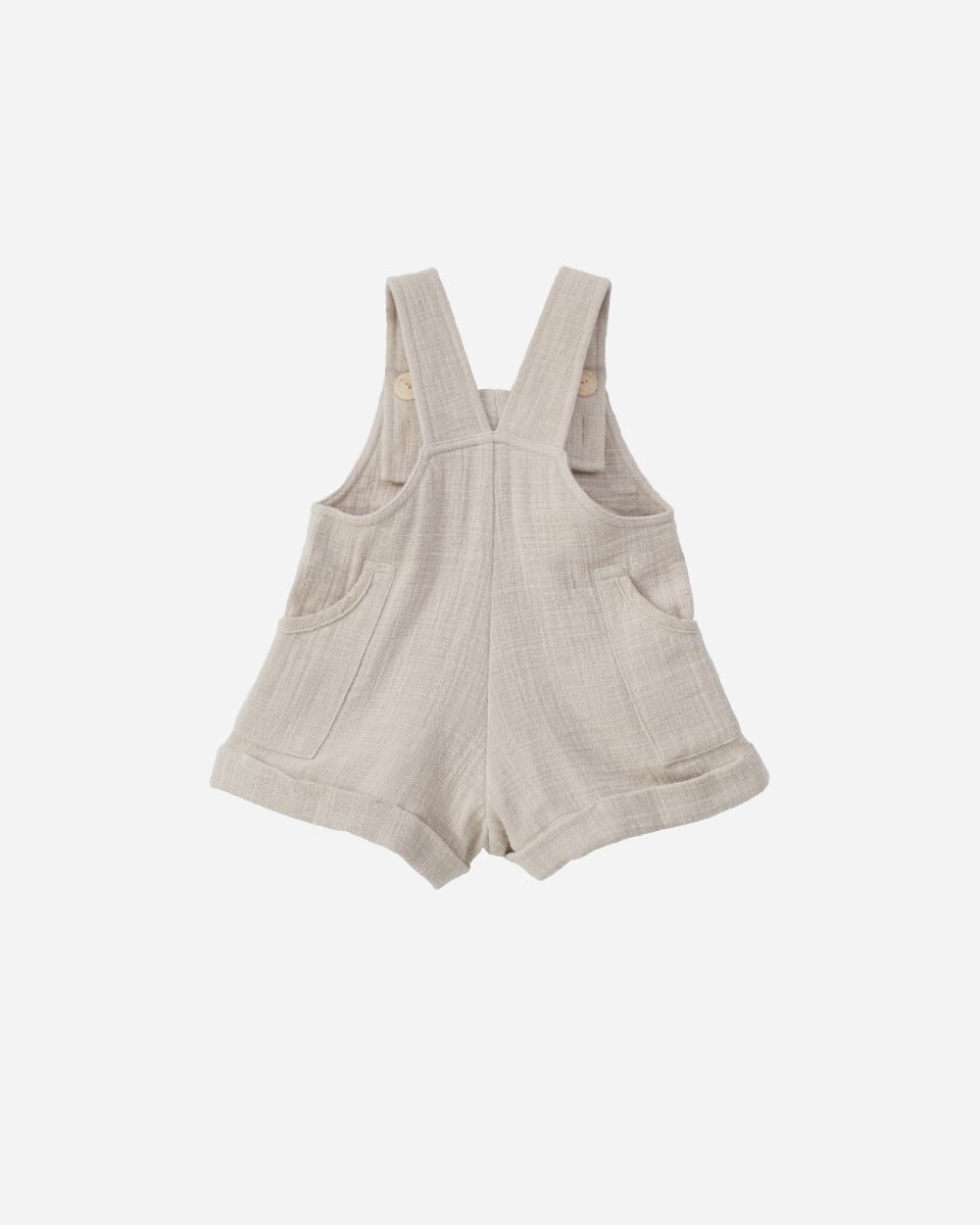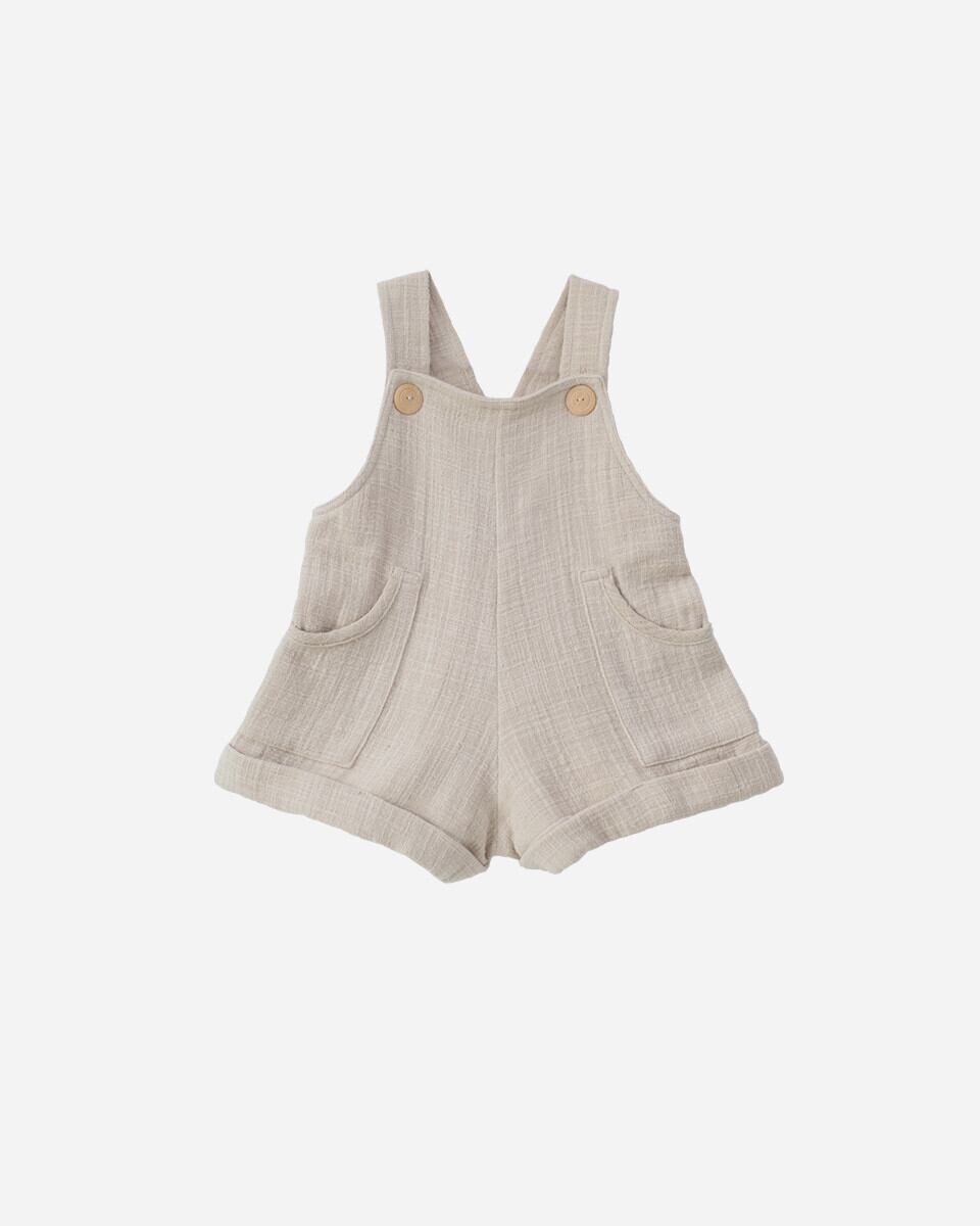 動きやすいゆったりとしたシルエットでデザインされたユニセックスのキッズサロペットです。風合いのあるコットンモスリン素材を使用し、美しいナチュラルカラーに染色され、木製ボタンがアクセントになっています。