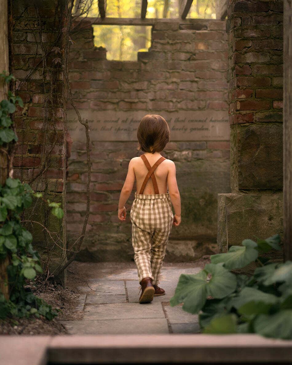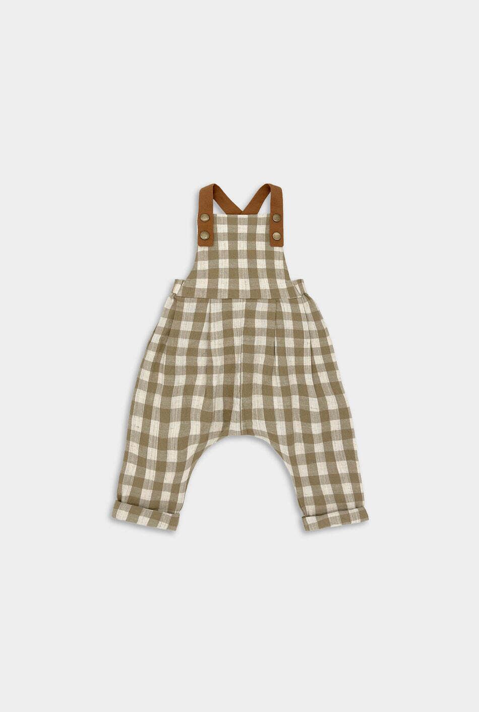ベージュのギンガム リネン ロング オーバーオールは、お子様のワードローブに快適さ、スタイル、多用途性を提供します。通気性のある生地、プリーツ、レザー風のストラップで作られています。